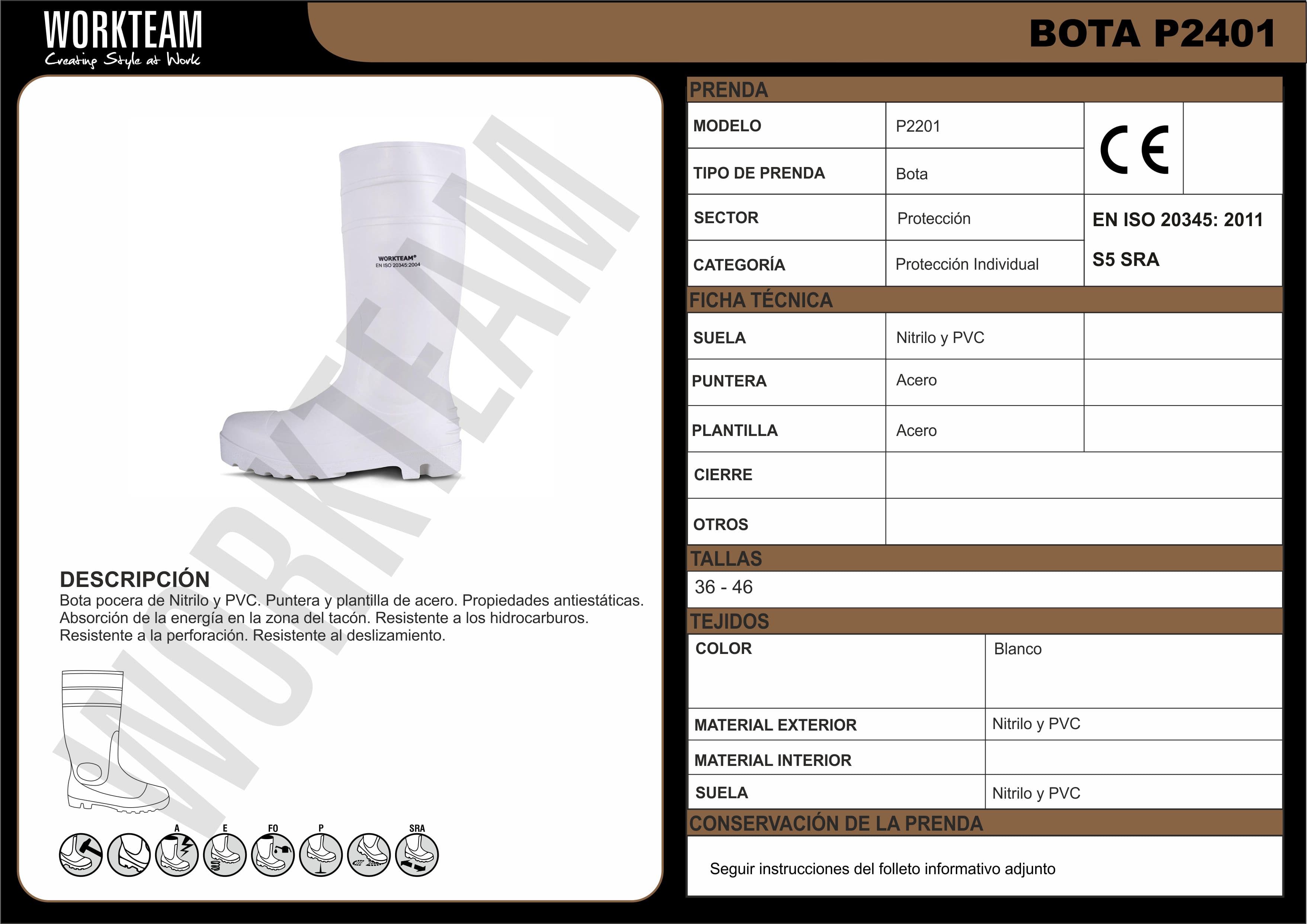 Bota pocera blanca. Nitrilo y PVC. Puntera y plantilla de acero. Propiedades antiestáticas. Absorción de la energía en la zona del tacón. Resistente a los hidrocarburos. Resistente a la perforación. Resistente al deslizamiento sobre baldosa cerámica con disolución de jabón. S5 SRA