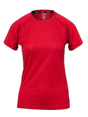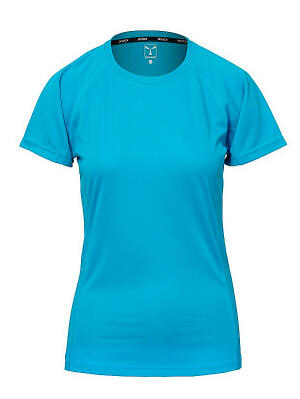 Camiseta técnica deportiva ceñida para mujer con mangas ranglán, doble costura lateral para mayor confort, cinta en el cuello.