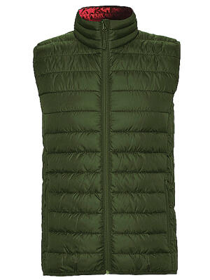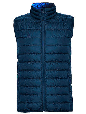 Chaleco acolchado resistente al agua. Cremallera frontal invertida al tono con protector de barbilla del mismo tejido. Bolsillos laterales con cremalleras invertidas al tono insertado en los paneles laterales con forma en pecho para mejor ajuste. Vivo elástico al tono en sisas y bajo. Opción de colores lisos o a contraste en interior.