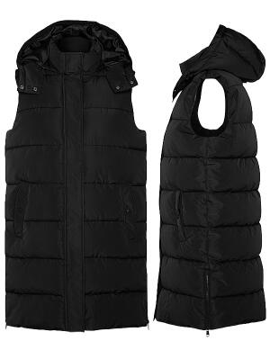 Chaleco acolchado de mujer con capucha extraíble. Cuello alto. Cierre frontal con cremallera oculta por solapa.