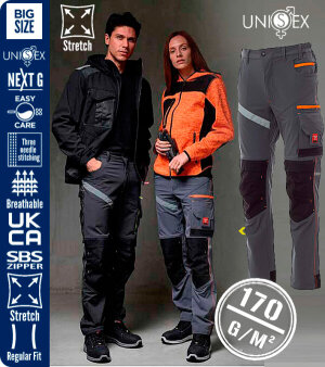 Pantalón unisex, tejido «4 way stretch», de verano, con elásticos laterales y trabillas en la cintura, cierre con cremallera y botón personalizado. En el delantero tiene dos bolsillos redondeados, un bolsillo pequeño para monedas a la derecha y un bolsillo pequeño de seguridad cerrado con cremallera a la izquierda. En la parte delantera de la pernera izquierda presenta 3 bolsillos: un bolsillo horizontal cerrado con una cremallera, un bolsillo con tapeta contorneada, con cierre de gancho y bucle y con soporte para tarjeta de identificación, y un bolsillo pequeño vertical cerrado con cremallera. Banda retrorreflectante en la parte delantera de la pernera derecha. Ambas perneras disponen de bolsillos para rodilleras en Nylon Oxford 500D con apertura por la parte superior. En la parte trasera presenta un bolsillo con tapeta y cierre de gancho y bucle, una anilla para el martillo, un bolsillo abierto para el metro y un bolsillo para el teléfono móvil con tapeta y cierre de gancho y bucle (pernera derecha); un bolsillo abierto con dos bandas retrorreflectantes (pernera izquierda); inserciones retrorreflectantes a la altura de la rodilla y cinta talonera de tejido en contraste (ambas perneras). También presenta pespuntes laterales y costuras de refuerzo en contraste en distintos puntos. En las tallas (italianas) centrales 48-50-52, el interior de la pernera tiene una longitud normal de 82 cm.