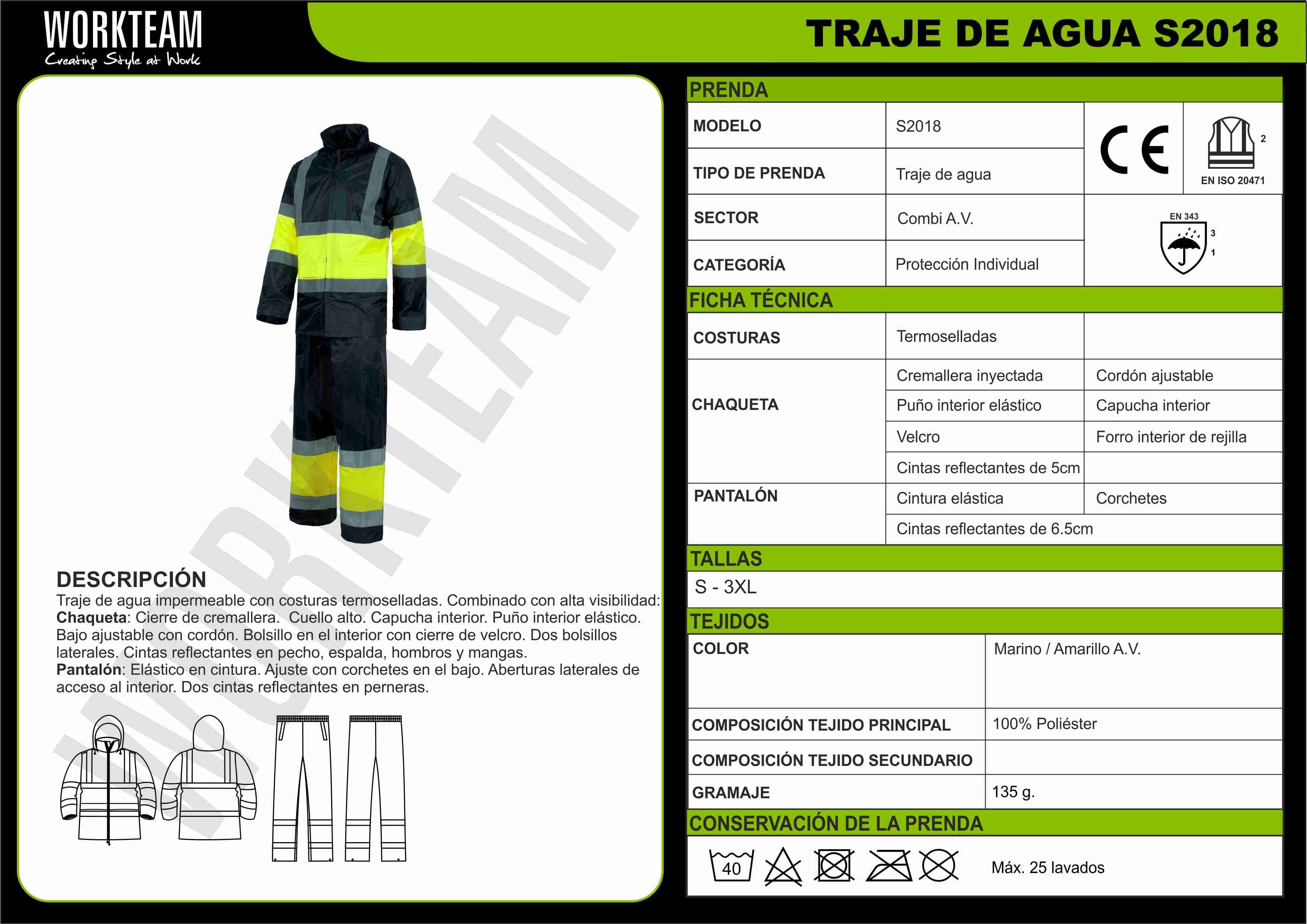 Traje de agua impermeable, combinado y con cintas reflectantes. Parte superior: Impermeable con cierre de cremallera. Cuello alto con capucha interior ajustable con cordón. Dos bolsos laterales solapados. Un bolso de pecho de plastón con velcro en el interior. Una cinta reflectante en hombros y dos en pecho, espalda y mangas con pieza central de alta visibilidad. Puño elástico en el interior de la manga. Bajo ajustable con cordón. Forro interior de rejilla. Parte inferior: Pantalón impermeable con cintura elástica. Dos cintas reflectantes en perneras con pieza central de alta visibilidad. Aberturas laterales de acceso al interior. Bajo ajustable con corchetes.