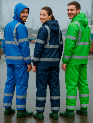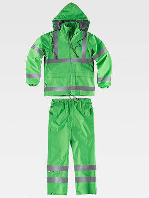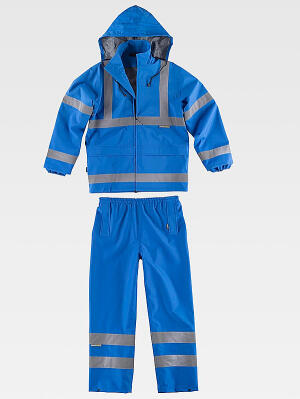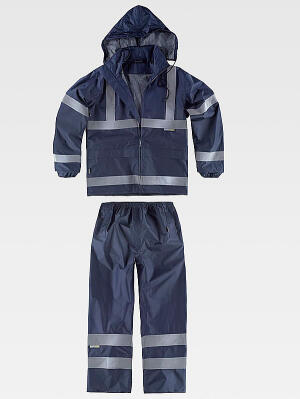 Traje de agua impermeable con cintas reflectantes. Parte superior: Impermeable con cierre de cremallera. Cuello alto con capucha interior ajustable con cordón. Dos bolsos laterales solapados. Un bolso de pecho de plastón con velcro en el interior. Una cinta reflectante en hombros y dos en pecho, espalda y mangas. Puño elástico en el interior de la manga. Bajo ajustable con cordón. Forro interior de rejilla. Parte inferior: Pantalón impermeable con cintura elástica. Dos cintas reflectantes en perneras. Aberturas laterales de acceso al interior. Bajo ajustable con corchetes.