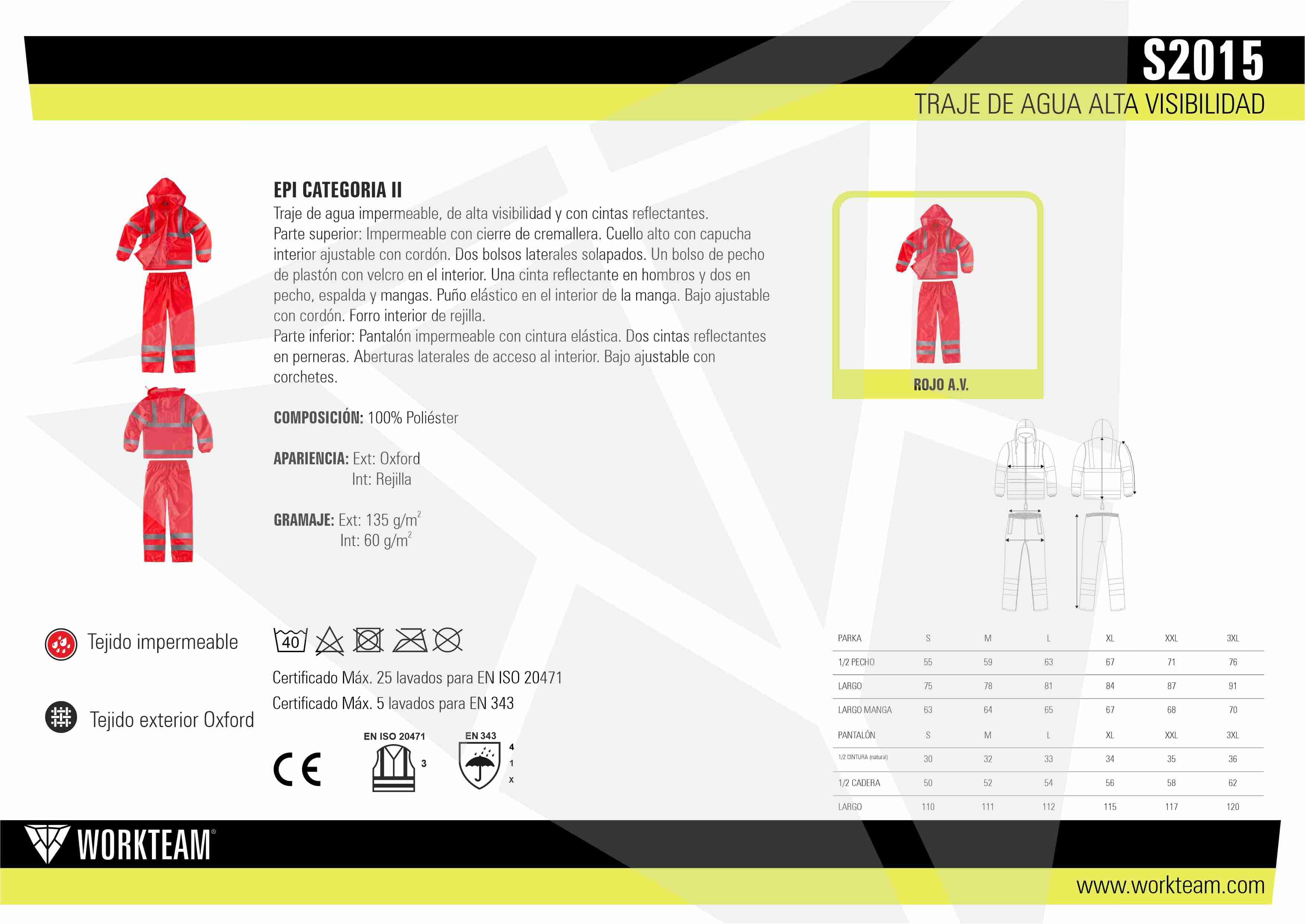 Traje de agua impermeable, de alta visibilidad y con cintas reflectantes. Parte superior: Impermeable con cierre de cremallera. Cuello alto con capucha interior ajustable con cordón. Dos bolsos laterales solapados. Un bolso de pecho de plastón con velcro en el interior. Una cinta reflectante en hombros y dos en pecho, espalda y mangas. Puño elástico en el interior de la manga. Bajo ajustable con cordón. Forro interior de rejilla. Parte inferior: Pantalón impermeable con cintura elástica. Dos cintas reflectantes en perneras. Aberturas laterales de acceso al interior. Bajo ajustable con corchetes.